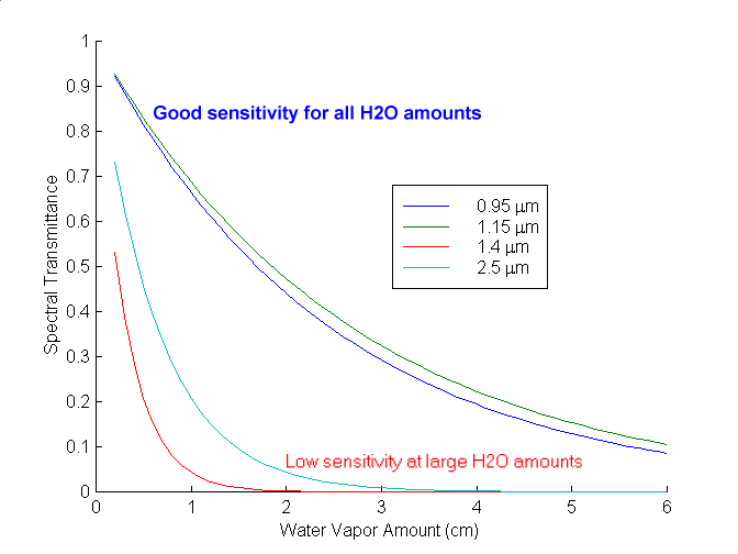 First think to do is find some wavelengths for which transmittance is sensitive to changes in water vapor amount. So I wrote a script to plot the following (note in the script I could select any 4 wavelengths). The stronger absorption lines are not very sensitive to change in large water paths, though they may be useful in polar regions where the water concentrations is small. The spectral regions near 0.95 and 1.15 microns have good sensitivity for a broad amount of atmospheric water vapor.