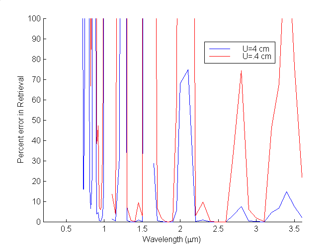 Of course, there is more gases in the atmosphere than water vapor. So at some wavelengths, absorption by other gases could result in errors. To investigate this I plotted the error in a retrieved water vapor amount as a function of wavelength. The matlab file to calculate this error is attached at the end. Notice, the retrieved amount is determined by allowing absorption by all gases as well as Rayliegh scattering. This was computed using two water vapor amounts, 4.0 cm (blue line) and 0.4 cm (red line). The results are depicted in the following figure.