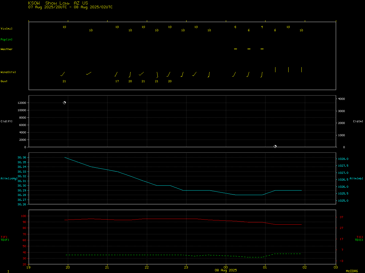The next satellite view was another infrared view at 0615 UTC (12:15 AM CST) on the 10th, seven hours after the previous one. Here, we see that the cyclone has propagated further to the north, with the dry slot as far north as western Wisconsin. This storm is exhibiting the classic comma shape that forecasters have come to recognize as being the signature of a significant midlatitude cyclone; a similar system can also be seen on the west coast of CONUS. Note that this image bears the hallmarks of a digitized analog image: the white latitudes, longitudes, and borders are not from McIDAS-V but are baked into the original image.