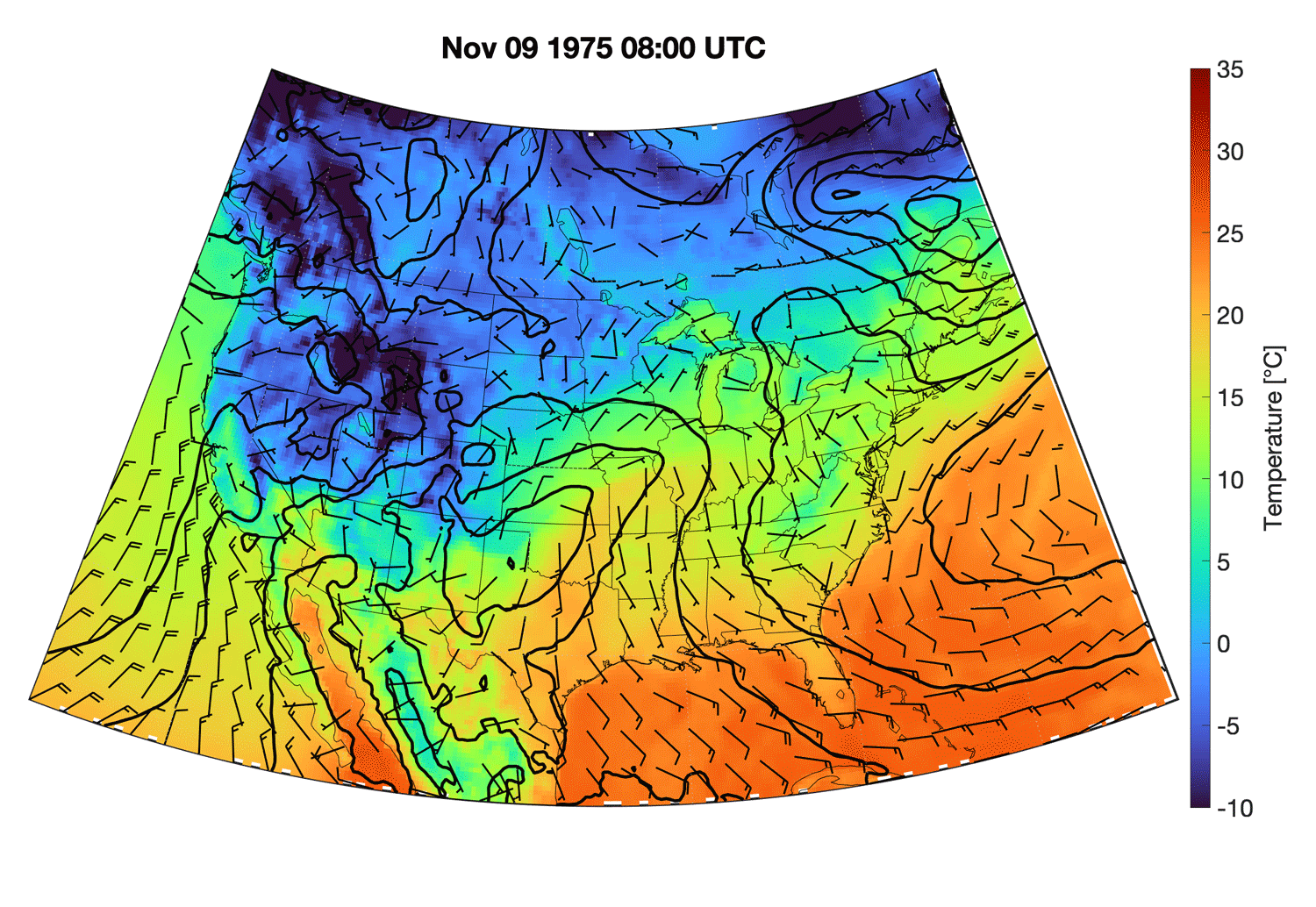 This ERA5 figure above depicts the environment at approximately the same time as the above satellite image. Solid contours represent isobars while the color field indicates the temperature in C. Wind barbs are in knots. The picture that emerges shows a textbook example of a midlatitude cyclone. Through the temperature gradients, both the cold front (running southward from Iowa to Texas) and the warm front (from Iowa to southern Ontario) can easily be seen. The isobars are elongated to the south, bending sharply around the cold front. Strong pressure gradients are found to the north and east of the low pressure system. The track taken by this storm is a classic example of a Panhandle Hook storm, so named for its origins near the Texas and Oklahoma panhandles and its sharp northward turn (or “hook”) to the upper Midwest. That’s clearly evident in the animation of the ERA5 from 0600 UTC on the 9th through 1400 UTC on the 10th (9:00 AM CST, about 10 hours before the wreck).