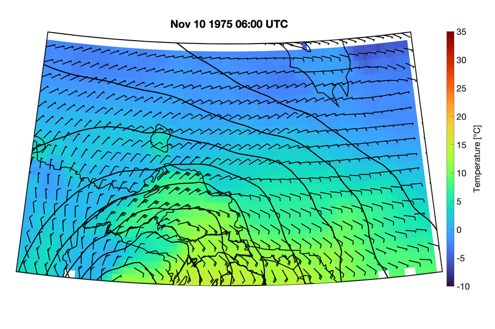 The last five hours of the ship’s life were a race to the harbor at Whitefish Bay. Unfortunately, the Fitzgerald was in a position that made it extremely vulnerable to the weather. The winds were from the northwest at 40+ knots. This was close to the worst case scenario, as gale force winds were blowing along the longest possible fetch for that location. Reports from a nearby ship, the Arthur M. Anderson, showed sustained waves as high as 25 feet. This next reanalysis image shows the conditions around the time the ship sank at 0000 UTC on the 11th (6:00 PM CST, 7:00 PM EST on the 10th). The red star marks the location of the shipwreck. While the ship was only 15 miles away from the safe harbor, the very strong winds and immense waves were too much. The exact mechanism by which the ship sank remains a topic of debate (including hatch failure, grounding on shoals, or stress fractures) but all agree that the wind and waves were the key to the ship’s fate.