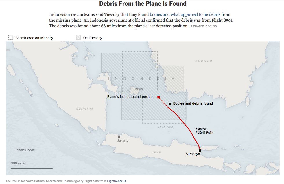 Map of AirAsia Flight 8501, and location of initial debris (credit: New York Times)