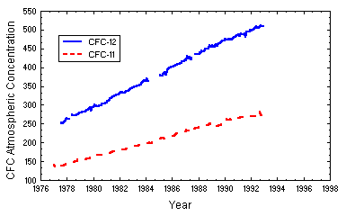 Chlorofluorocarbons or CFCs do not occur naturally. CFCs were made for propellants in spray cans, Styrofoam puffing agents, and as coolants for refrigerators and air conditioners. The usage of two CFC compounds (CFC-11 and CFC-12) decreased in the mid 1970s. When this human made, or anthropogenic, gas was found to destroy ozone, the United States banned its use, resulting in a decline of global usage.